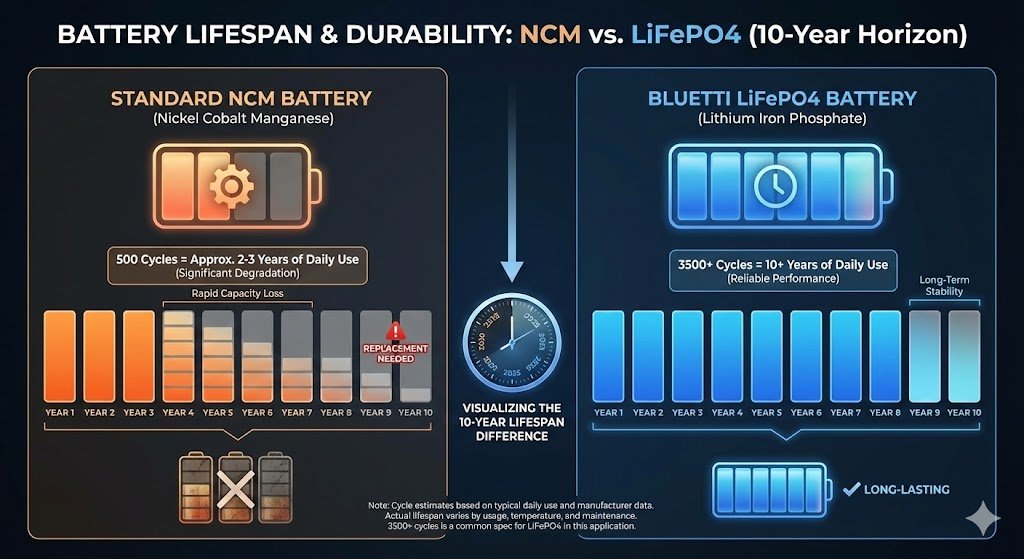 Old-school power stations used Lithium-Ion (NCM) batteries—the kind found in your phone. They are light, but they degrade quickly (500-800 cycles) and can be volatile. BLUETTI champions LiFePO4 (Lithium Iron Phosphate) battery technology.