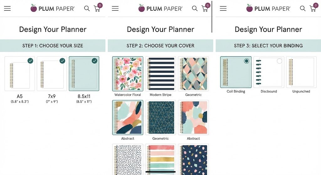Do you prefer a metal coil that feels sturdy? Or perhaps a disc-bound system (like the Happy Planner style) so you can add and remove pages? Plum Paper offers coil-bound, loose-leaf (punched for discs), and even unbound options.